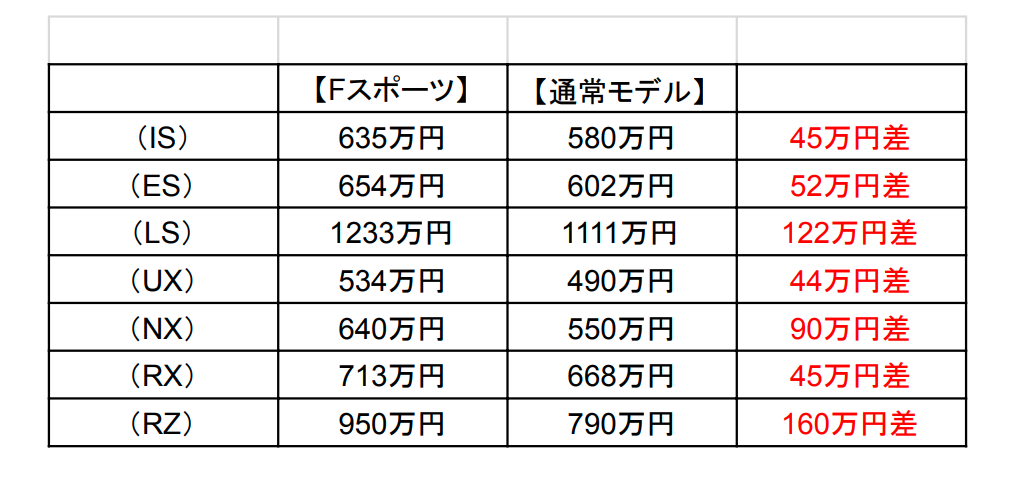 最後にFスポーツと通常モデルの価格差を見てみましょう。
